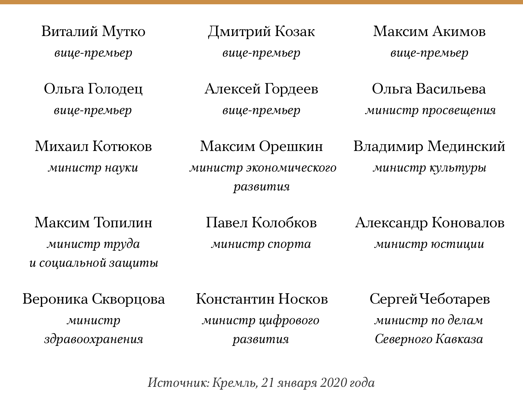 21 января премьер-министр Михаил Мишустин представил президенту Владимиру Путину новое правительство России. В нем будет девять вице-премьеров вместо десяти. Шестеро из них новые, в том числе первый вице-премьер. Им стал помощник президента Андрей Белоусов. Из 21 министерства руководители сменились в девяти. В частности, свои посты покинули министр культуры Владимир Мединский, министр просвещения Ольга Васильева, министр здравоохранения Вероника Скворцова и министр экономического развития Максим Орешкин.
