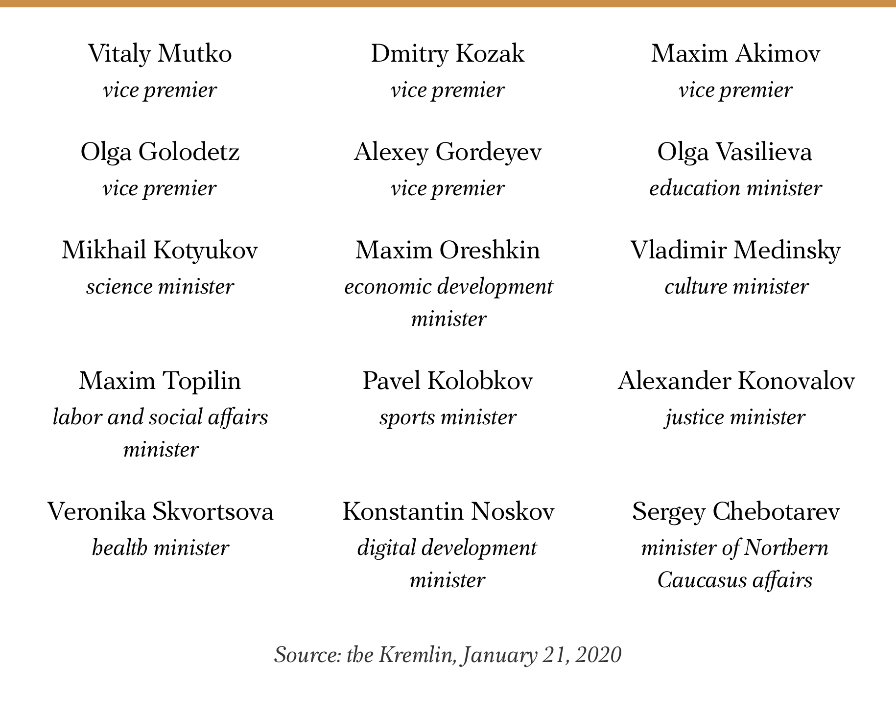 On January 21, Russian Prime Minister Mikhail Mishustin presented his newly selected cabinet to Vladimir Putin. It includes nine vice premiers rather than 10, and six of those individuals are new to their posts. Nine ministry portfolios were transferred into new hands. Vice Premiers Yury Trutnev, Yury Borisov, and Tatiana Golikova are still with us. So is Finance Minister Anton Siluanov, though his other job as first vice premier has gone to Putin advisor Andrey Belousov instead. Defense Minister Sergey Shoigu, Foreign Minister Sergey Lavrov, and Internal Affairs Minister Vladimir Kolokoltsev will also keep their posts. Among the new vice premiers appointed to serve in Mishutin’s new cabinet are Rosreestr head Viktoria Abramchenko, Federal Tax Service deputy head Alexey Overchuk (who served under Mishustin in that role), Moscow Vice Mayor Marat Khusnullin, and Gazprom Media board chair Dmitry Chernyshenko. Konstantin Chuychenko, formerly a vice premier and the cabinet’s chief of staff, is now the justice minister. Former education regulatory chief Sergey Kravtsov has been appointed minister of education, government film department head Olga Lyubimova has taken over as culture minister, and the Ministry of Northern Caucasus Affairs has been eliminated (though longtime Attorney General Yury Chaika will serve as a presidential envoy to the region).