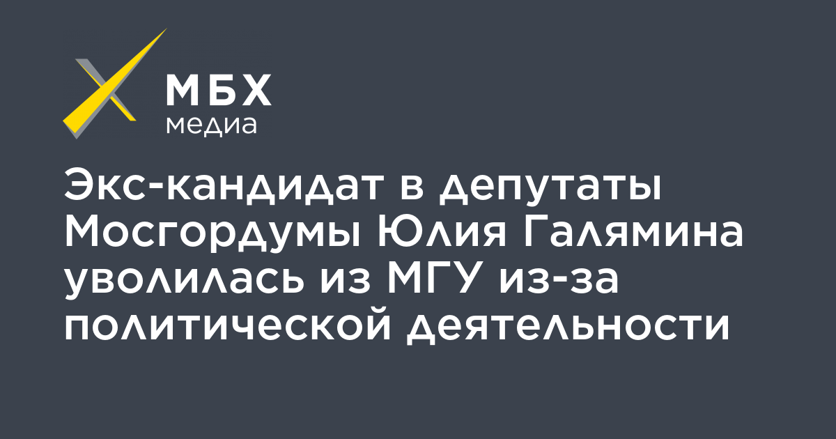 Бывший кандидат на выборах депутатов Мосгордумы Юлия Галямина уволилась из МГУ по собственному желанию из-за политической деятельности. Об этом она рассказала «МБХ медиа».