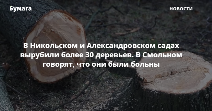 В Никольском и Александровском садах вырубили в общей сложности 35 деревьев: старинные вязы и клен. Об этом написала «Фонтанка» с места событий.