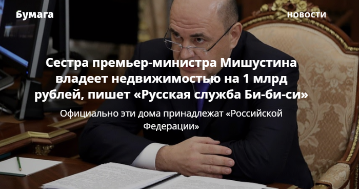 Общая стоимость недвижимости, которой владеет сестра нового премьер-министра России Михаила Мишустина Наталия Стенина, превышает 1 млрд рублей. Об этом сообщает «Русская служба Би-би-си» со ссылкой на закрытую базу данных Федеральной налоговой службы РФ. Доступ к ней журналисты получили от источника, имеющего к ней доступ.