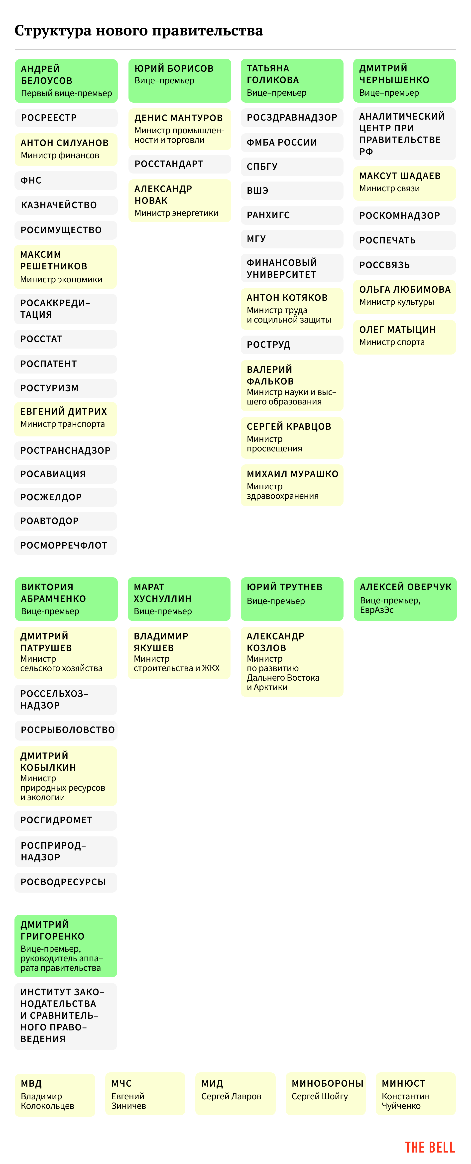 О том, как распределятся полномочия в новом правительстве, The Bell рассказали два чиновника. Из их слов выходит, что больше всего сфер ответственности будет у первого вице-премьера Андрея Белоусова. Кроме Минфина и Минэкономразвития, у него в подчинении будет Минтранс.