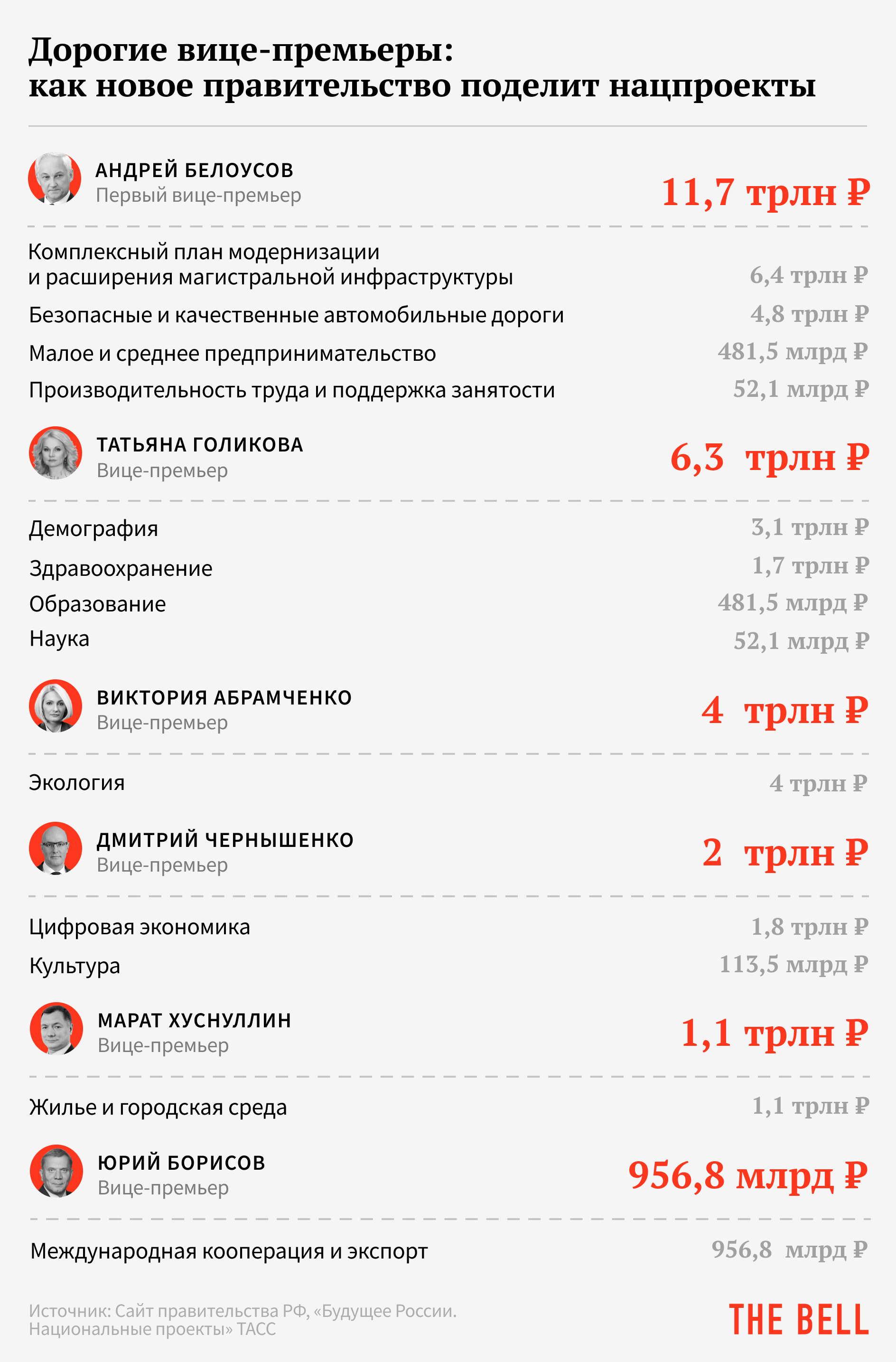 Главным приоритетом правительства станет реализация нацпроектов с бюджетом 26 трлн рублей. Здесь решающая роль будет у вице-премьеров, которых в новом правительстве девять — всего на одного меньше, чем в кабинете Дмитрия Медведева. Их мы решили проранжировать по бюджетам вверенных им нацпроектов.
