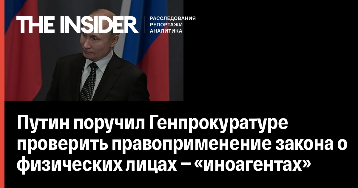 Президент Владимир Путин поручил Генпрокуратуре проверить правоприменение закона о физических лицах — «иностранных агентах». Об этом говорится в сообщении на сайте Кремля.