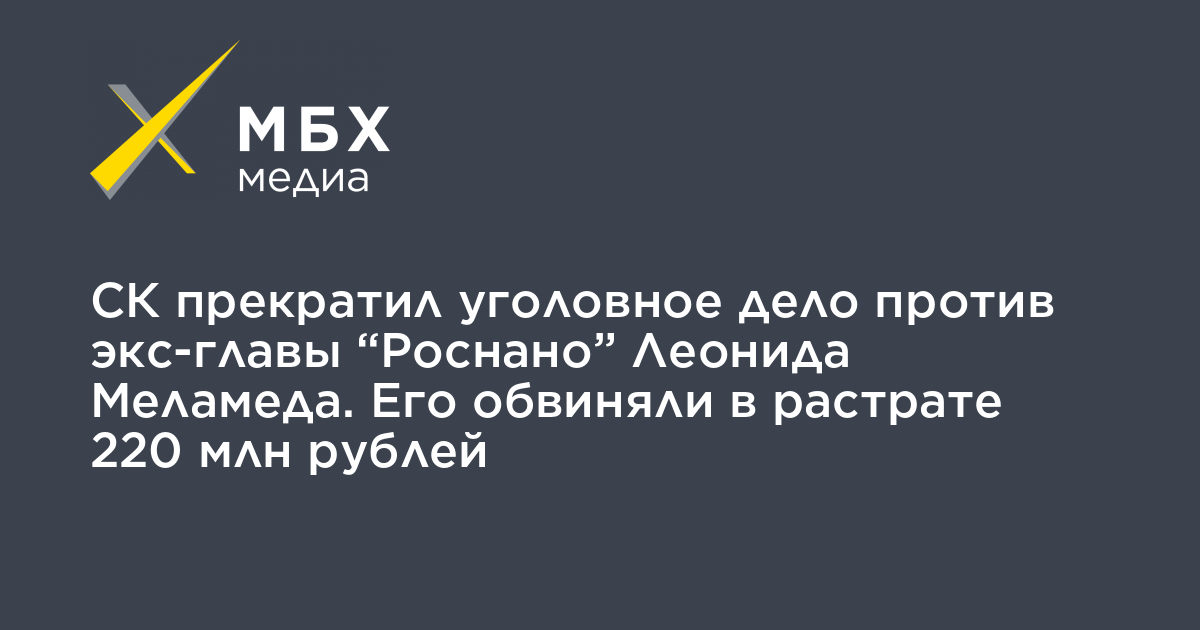 СК прекратил уголовное дело против экс-главы «Роснано» Леонида Меламеда. Его обвиняли в растрате 220 млн рублей