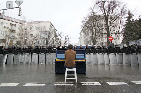 На Майдане, например, в самый разгар революционных событий конца 2013 года их участники начали объединяться в квазихудожественные инициативы и создавать очень интересные гражданские перформансы. Например, когда женщины встали перед рядами «Беркута» с зеркалами и надписью «Боже, неужели это я?» Или пианист Маркиян Мацех, который играл Шопена перед стеной силовиков. Или то, как выглядел стихийный городок на Майдане, — это вообще можно было назвать тотальной инсталляцией. С одной стороны, было страшно, с другой — потрясающе эстетично. И сделано это было обычными людьми, а не профессиональными художниками.