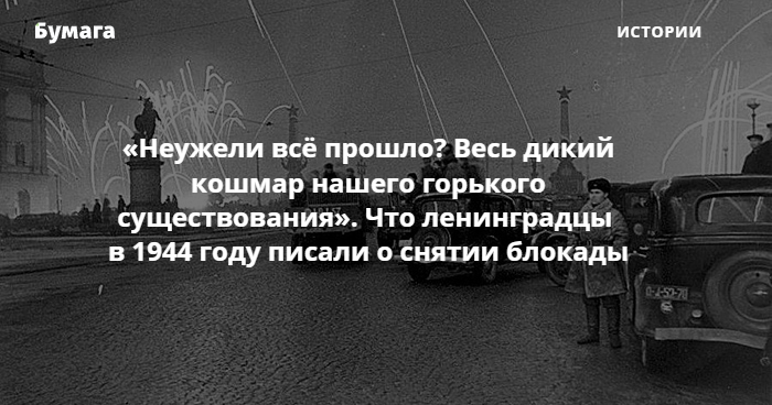 Как ленинградцы в 1944 году праздновали снятие блокады, радовались салюту и вспоминали погибших и что происходило в этот день на улицах города? В годовщину полного освобождения Ленинграда от фашистской блокады «Бумага» совместно с проектом «Прожито» публикует отрывки из дневников школьников, поэтов и медсестер, переживших блокаду.