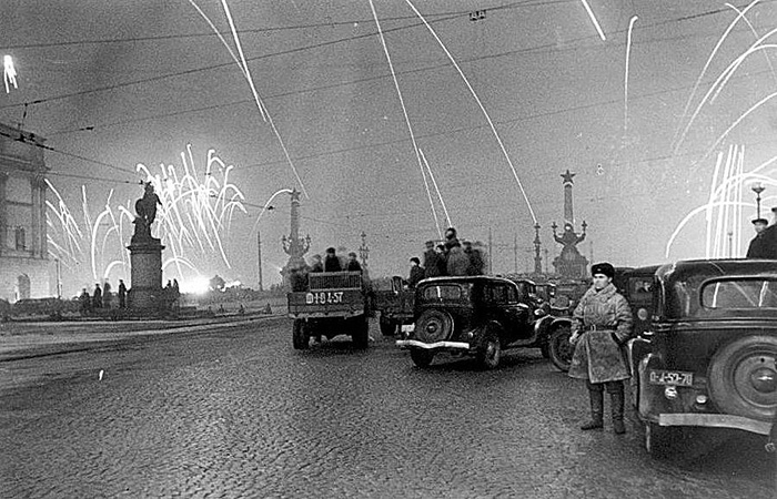 27 января. Уже несколько дней носились слухи о салюте в Ленинграде, говорили, что на Марсовом поле устанавливают пушки… Верилось и нет. Сегодня днем стало ясно, что салют будет. Из РОНО пришла телефонограмма, чтобы вечером слушали радио, а утром провели митинг. Пришла домой в 6 часов и легла не выключая радио. Около 8-ми часов два раза передали приказ по войскам Ленинградского фронта за подписями Говорова, Жданова, Кузнецова, Соловьева и Гусева. Там уже прямо говорилось, что будет дано 24 залпа из 324 орудий. Я выключила радио, гремели пушки; открыла штору — на улице светло как днем. Над крышами развеваются ракеты, зеленые, белые, красные звезды. По коридору мечется старуха Игнатьева. «Господи, что случилось?» Накидываю пальто и бегу на улицу по парадной. На Мойке масса народа. Светло так, что узнаем знакомых. В белых фронтовых полушубках бойцы, охраняющие порядок. Но беспорядка нет. По небу бегают сильные лучи прожекторов. Гул салютов. «Дожили», — чаще всего слышится в толпе. Минута в жизни города незабываемая. И так скучно и тоскливо в этот вечер быть одной.