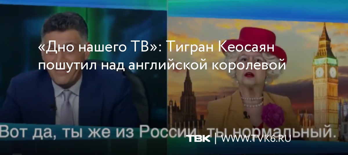 На последнее заявление «королевы» Кеосаян ответил, что не против, чтобы Путин правил столько же, сколько ее величество.Тигран Кеосаян в своей программе на НТВ показал миниатюру с английской королевой Елизаветой II. Он инсценировал «общение» в формате телемоста. Приводим некоторые фрагменты передачи: