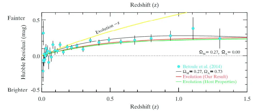 Невязки в диаграмме Хаббла вычисляются в рамках космологической модели без Λ (Ωm = 0.27, ΩΛ = 0,00; черная пунктирная линия). Красная и зеленая линии — два варианта модели эволюции сверхновых, предложенных авторами статьи [3]. Голубые кружочки — это бинированные (усредненные в некотором диапазоне красных смещений) данные по сверхновым из работы Betoule et al. (2014). По выводам авторов, сравнение эволюционных кривых с данными по сверхновым показывает, что эволюция светимости может имитировать значительную долю невязок в диаграмме Хаббла, использованных при открытии и заключении о существовании темной энергии (см. черную сплошную линию)