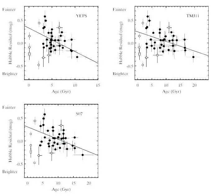 «… Значимую корреляцию между светимостью сверхновых и возрастом звездного населения на уровне достоверности 99.5%. Это [показал] самый прямой и строгий тест, который когда-либо проводился для эволюции SN Ia. Так как прародители в родительских галактиках становятся моложе с ростом красного смещения (при взгляде назад по времени), этот результат указывает на серьезный систематический байес (сдвиг в распределении) с ростом красного смещения в космологии сверхновых. Если применить эти величины, то обнаруженная эволюция светимости получается настолько значимой, что ставит под сомнение само существование темной энергии. При учете должным образом эволюции светимости сверхновых команда обнаружила, что доказательство существования темной энергии просто уходит».