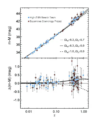 Верхний график — результаты измерений, нижний график — разность между данными верхнего графика и ожидаемыми измерениями в простом расширяющемся евклидовом мире без темной энергии