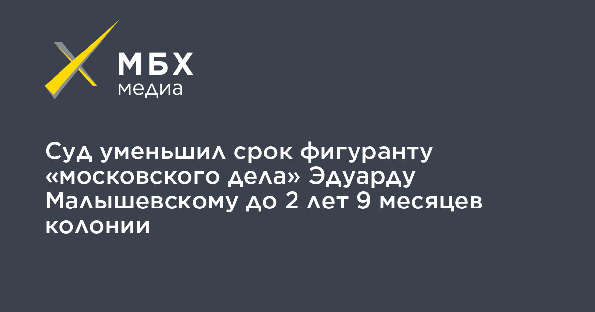 Мосгорсуд изменил приговор фигуранту «московского дела» Эдуарду Малышевскому, которому дали три года колонии по делу о применении насилия к сотруднику полиции (часть 1 статьи 318 УК), смягчив наказание до двух лет девяти месяцев заключения. Об этом сообщает корреспондент «МБХ медиа» из зала суда.