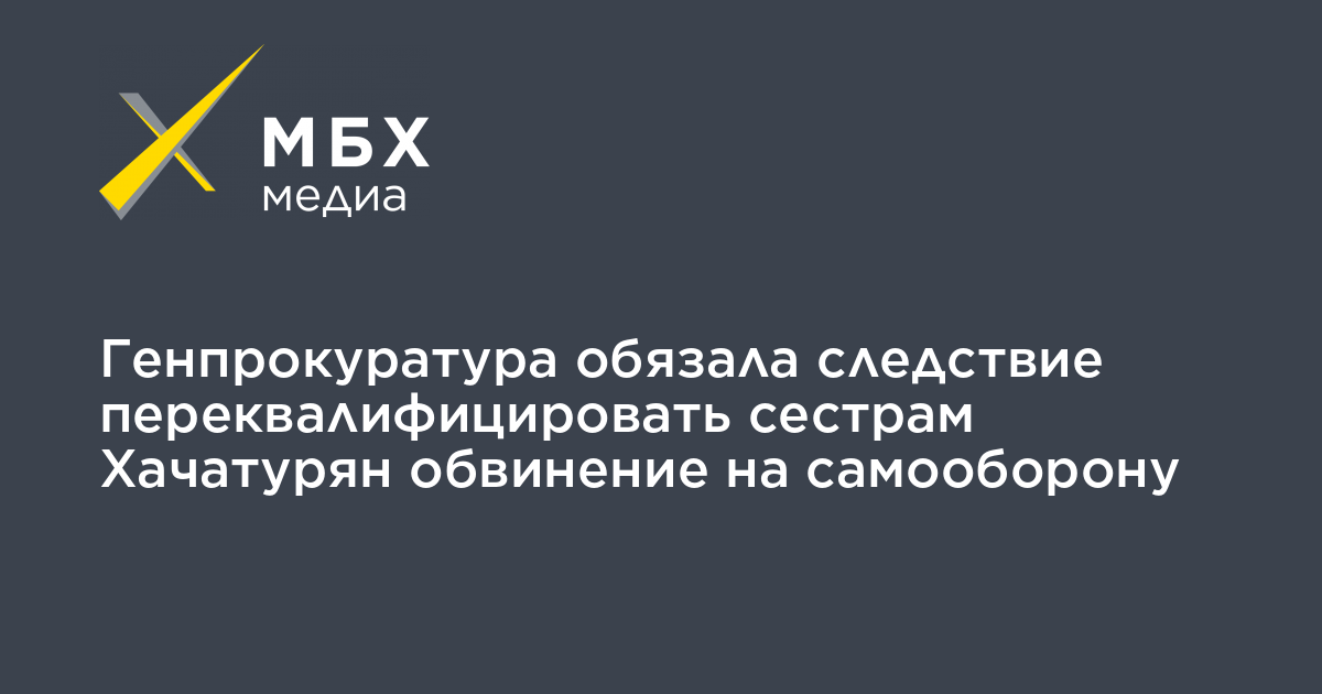 Генпрокуратура обязала СК изменить обвинение сестрам Хачатурян с убийства (п. «ж» ч. 2 ст. 105 УК) на самооборону (ст. 37 УК), сообщил «МБХ медиа» адвокат Крестины Хачатурян Алексей Липцер.