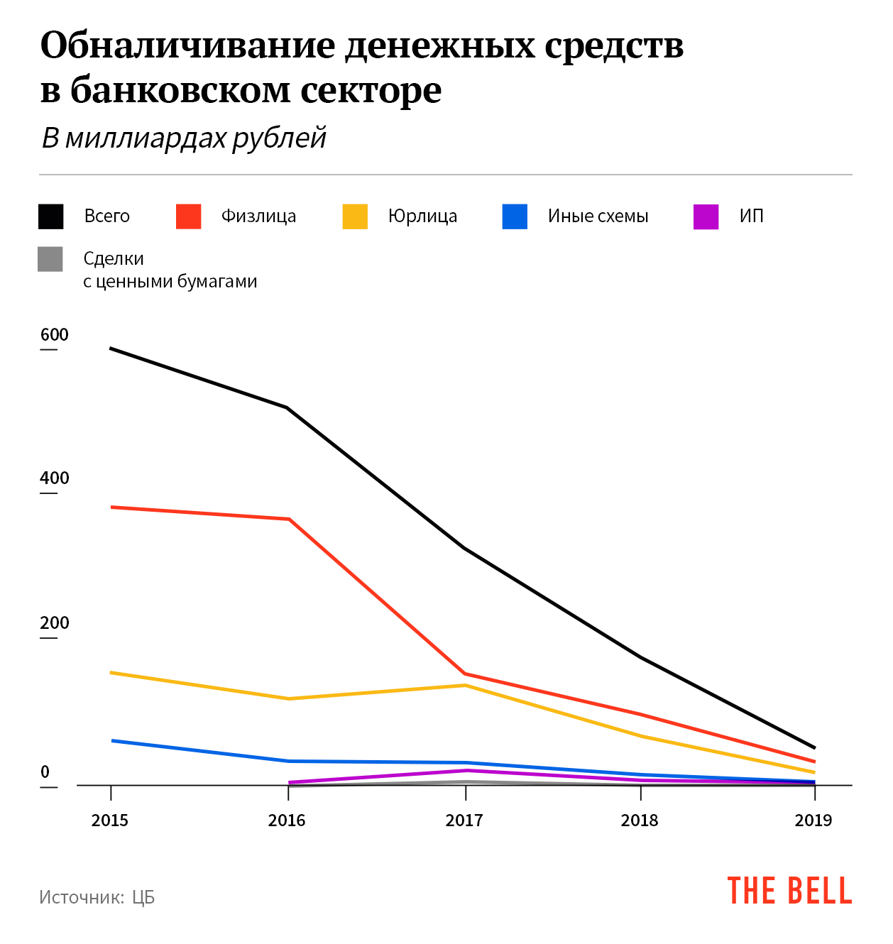 ЦБ начал публиковать статистику по обналичиванию денег в банковском секторе только в 2015 году. За четыре года объем этого рынка, по оценке регулятора, сократился в разы. В первой половине 2019 года, например, ЦБ оценил его всего в 48 млрд рублей. Даже если экстраполировать эту цифру на год, получится в 6 раз меньше, чем было в 2015-м. Подробно о борьбе с обналом мы рассказали в первом материале цикла «Страна наличных».