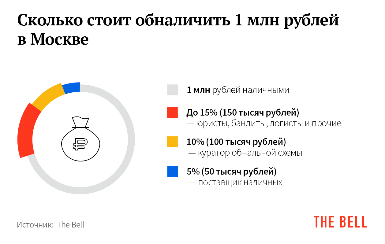 Покупатели нала чаще всего расплачиваются за него безналом. Борьба властей с теневым финансовым рынком привела к резкому росту цен. Если еще в начале 2010-х за обнал, по словам зампреда ЦБ Дмитрия Скобелкина, брали 2–3% суммы, то теперь — 15–30%. С этой оценкой согласны собеседники The Bell из обнального бизнеса.