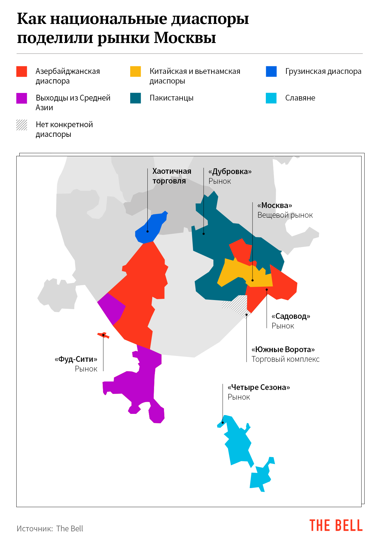 На большинстве рынков обнал контролируют национальные диаспоры, говорят собеседники The Bell, занятые в этом бизнесе. Определить доминирующую на рынке диаспору несложно — достаточно прогуляться по торговым рядам. Некоторые диаспоры наряду с традиционными обнальными схемами практикуют оригинальные — такие, например, как метод обнала материнского капитала «Обнал халяль».