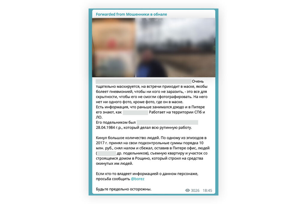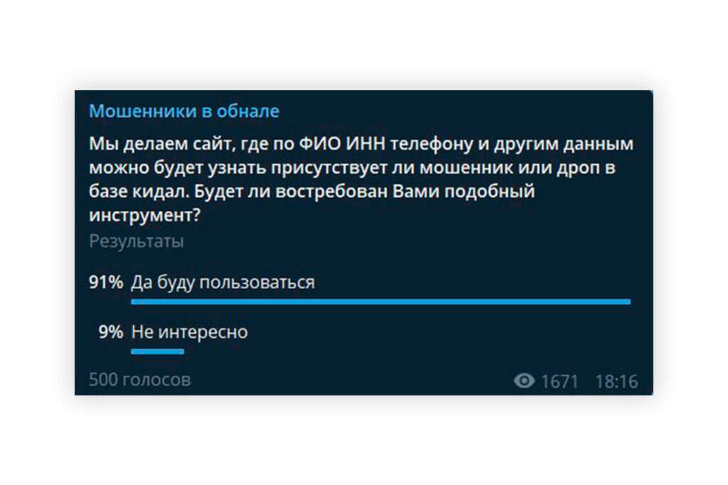 Фотографии и сканы паспортов кидал регулярно публикует, например, Telegram-канал «Мошенники в обнале». Недавно он пообещал разработать единую базу кидал, в которой будет поиск по ИНН и номеру телефона.