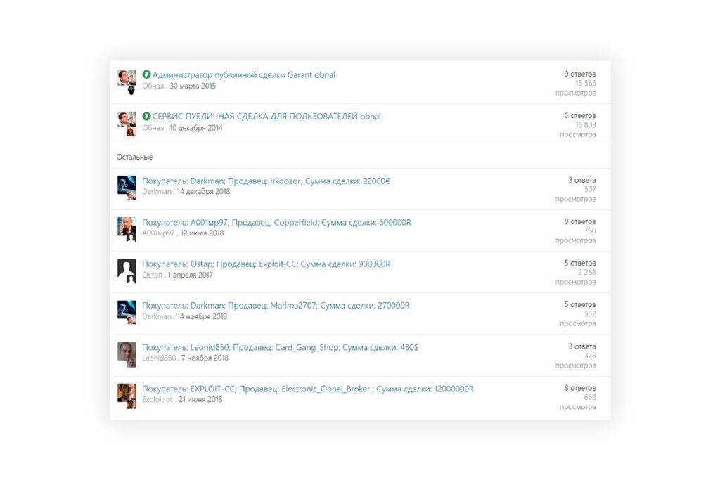 Еще один вариант подстраховки — опубличивание сделок. В открытом доступе могут публиковаться никнеймы обнальщиков и суммы, а также есть отзывы об успешном или неуспешном переводе денег.