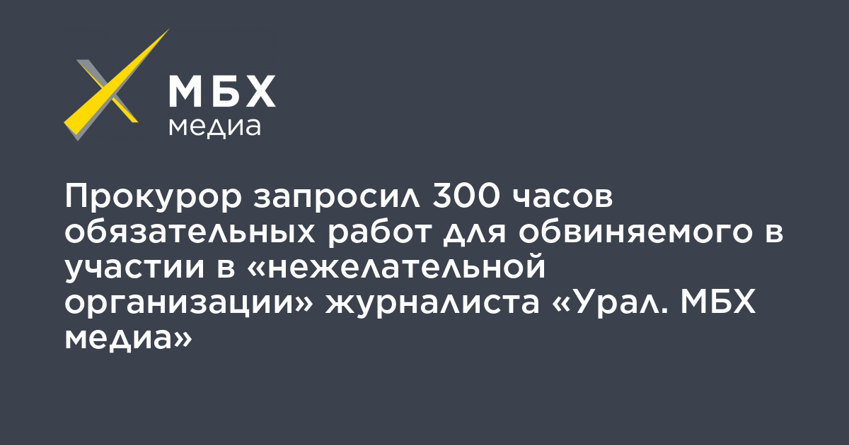Прокурор запросил для редактора «Урал. МБХ медиа» Максима Верникова, обвиняемого в осуществлении деятельности «нежелательной организации» (статья 284.1 УК), 300 часов обязательных работ. Об этом сообщает корреспондент из зала суда.