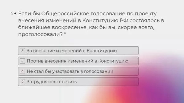 Во второй части опроса необходимо ответить, собираетесь ли вы принять участие в общероссийском голосовании о поправках в Конституцию, и как бы проголосовали, если бы оно проходило в ближайшее воскресенье – за поправки, против, не стали бы голосовать или затрудняетесь ответить.