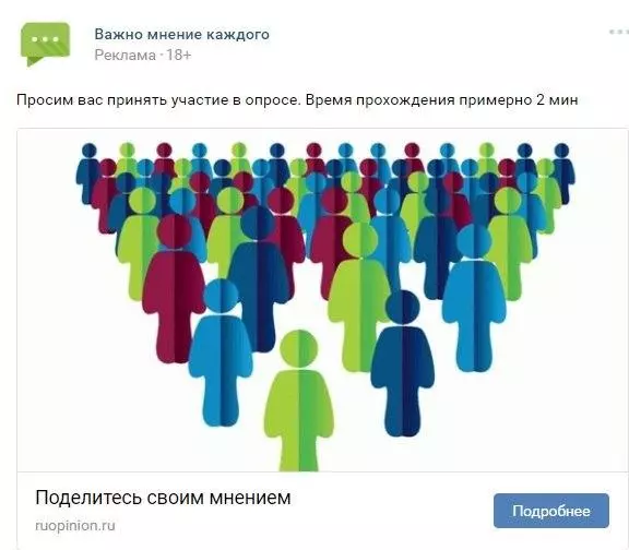 Реклама показывается пользователям старше 18 лет, ссылка ведет на страницу площадки ruopiniоn.ru, где авторы исследования называют себя «профессиональной ассоциацией независимых социологов». При этом сама ссылка ruopiniоn.ru ведет на пустую страницу на конструкторе сайтов Tilda.