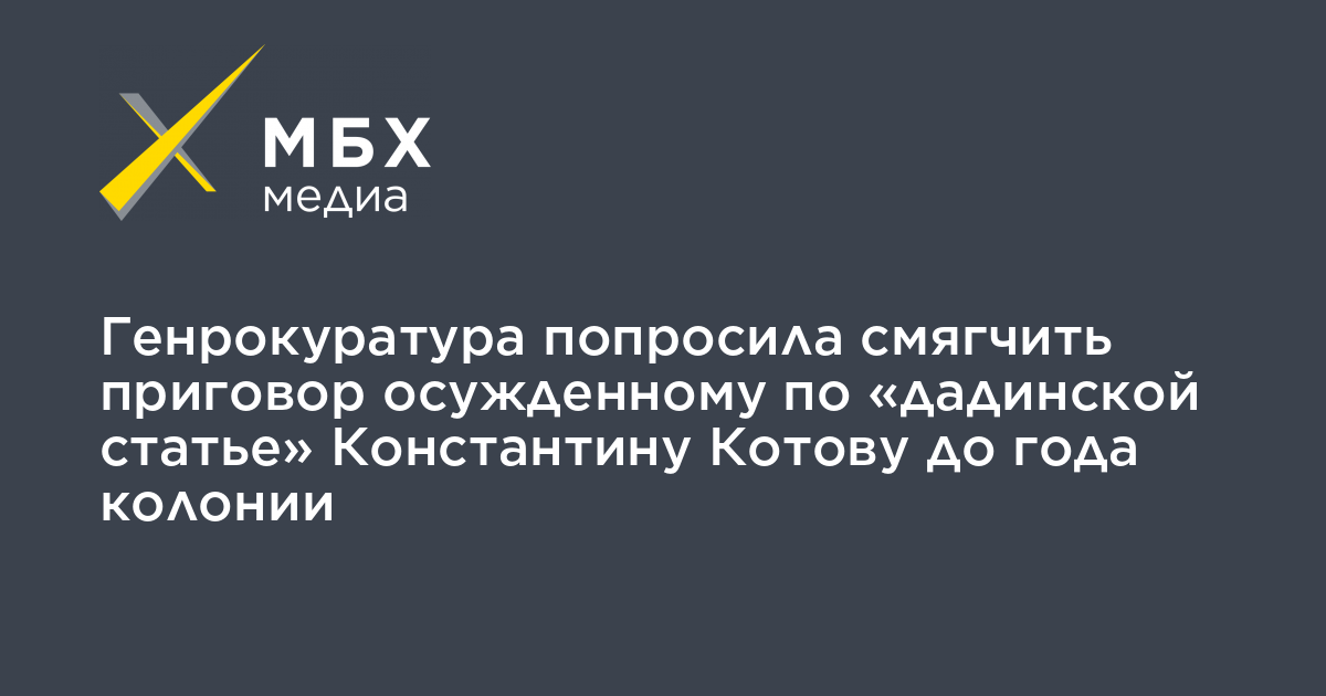 Генпрокуратура попросила кассационный суд снизить срок лишения свободы для осужденного по «дадинской статье» (ст. 212.1 УК) Константина Котова с четырех лет до одного года. Об этом «МБХ медиа» сообщила адвокат Мария Эйсмонт.