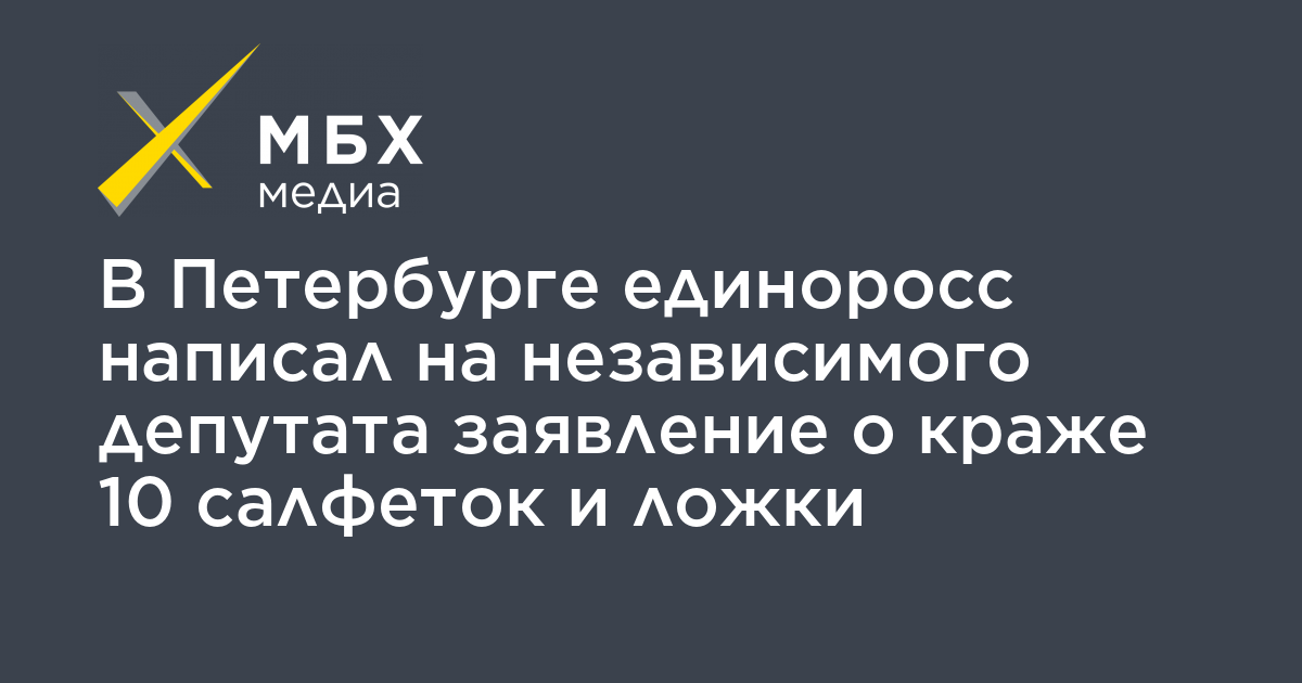В Санкт-Петербурге глава муниципального собрания округа Лиговка-Ямская Вадим Войтановский от «Единой России» написал заявление на оппозиционного муниципального депутата Александра Изотова о краже 10 салфеток и ложки. Об этом Изотов сообщил «МБХ медиа».