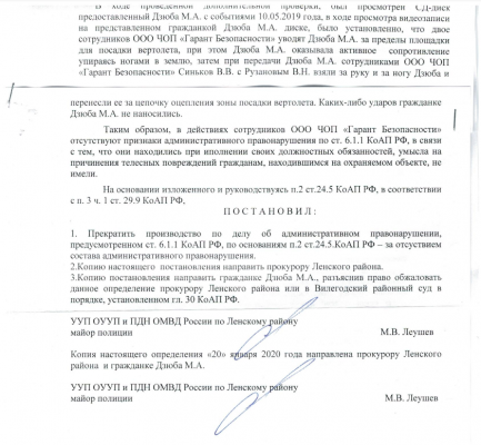 «Двое сотрудников ООО ЧОП „Гарант Безопасности“ уводят Дзюба М.А. за пределы площадки для посадки вертолета, при этом Дзюба М.А. оказывала активное сопротивление, упираясь ногами в землю, затем при передаче Дзюба М.А. сотрудниками ООО ЧОП „Гарант Безопасности“ Синьков В.В. с Рузановым В.Н. взяли за руку и за ногу Дзюба и перенесли ее за цепочку оцепления зоны посадки вертолета. Каких-либо ударов гражданке Дзюба М.А. не наносилось», — пишут полицейские в постановлении по делу.