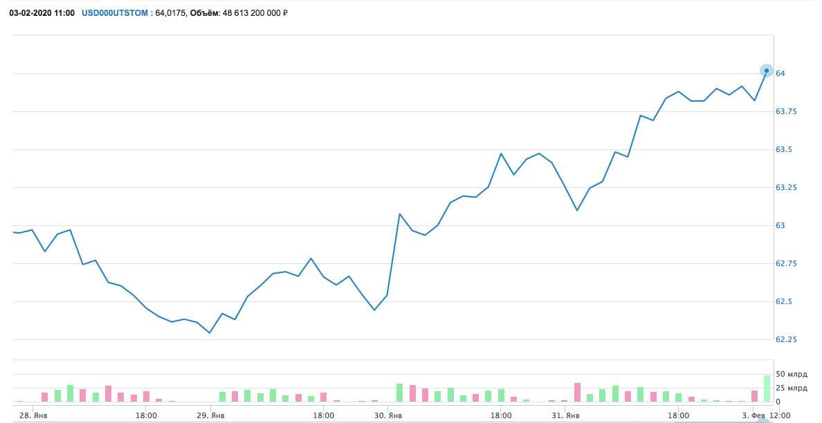 К 12:00 мск понедельника рубль подешевел к доллару на 14 копеек и преодолел отметку в 64 руб./$. Эксперты говорят, что сейчас участники рынка ждут новых сигналов для определения направления движения, в центре их внимания остается вспышка коронавируса в Китае.