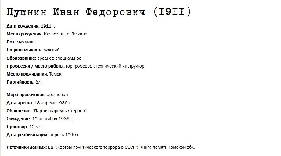 Это тот самый Иван Пушнин, агент органов НКВД, искусственно создавший «Партию народных героев Польши», которому по ходатайству НКВД заменили расстрел десятью годами. В 37-38 годах его использовали в качестве и провокатора, подсаживая в камеры к заключенным. По целому ряду дел того периода, следствие по которым вел Великанов Николай Сергеевич, начальник отделения Томского горотдела НКВД, проходила фамилия «подсадной утки» Пушнина. Именно Великанов направлял тогда деятельность Пушнина, поручал ему ведение дел, то есть допрос обвиняемых, и Великанов же сумел избавиться от Пушнина, отправив его по этапу для отбытия наказания, кажется, под Магадан.