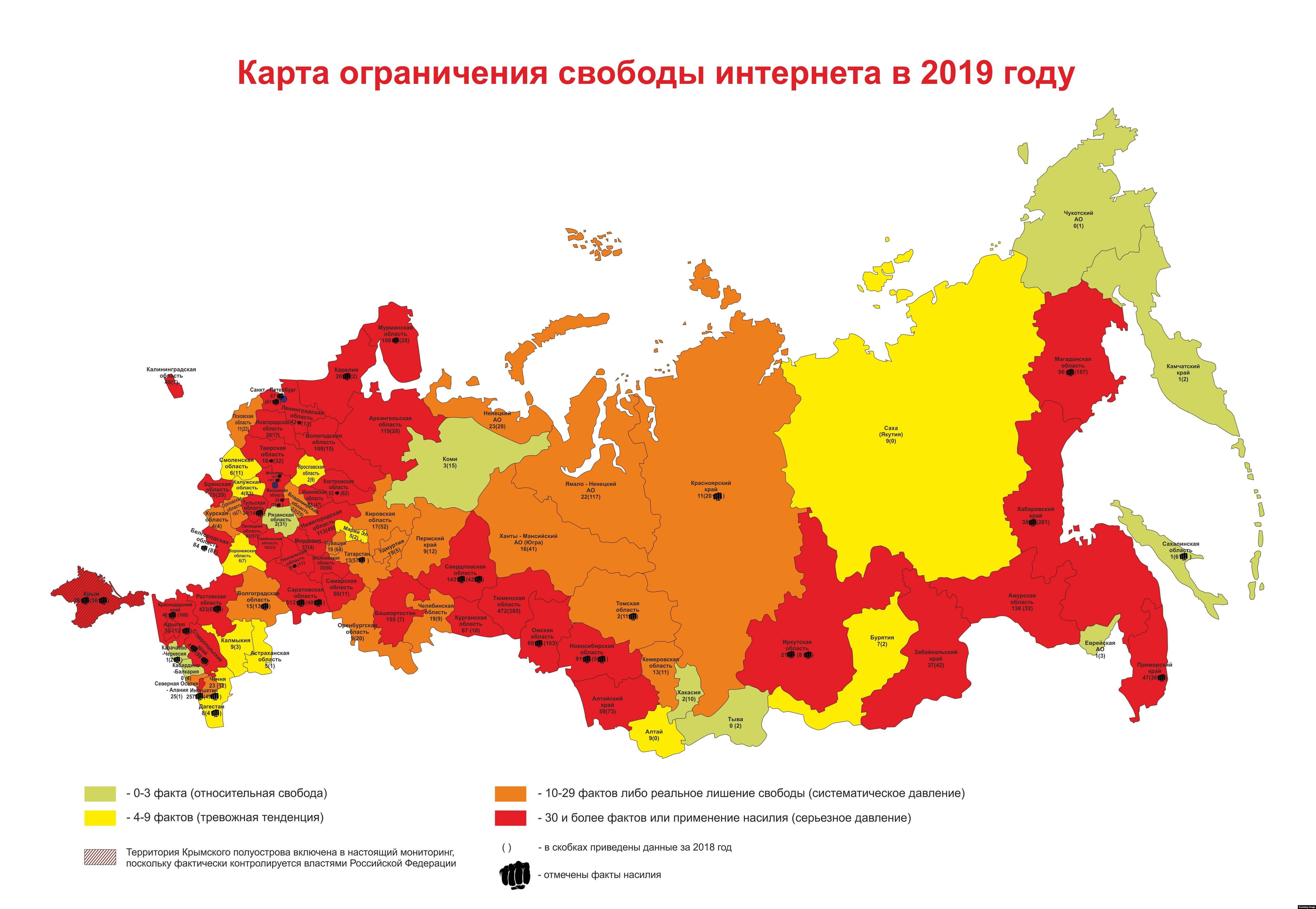 В 2019 году авторы доклада зафиксировали 438 981 (в 2018 году — 662 842) случай вмешательства в свободу интернета в России, из которых большинство (434 275), связано с ограничением доступа к интернет-сайтам и сервисам, а также запретом информации по различным основаниям. 38 человек оказались в тюрьме, 4 миллиона ресурсов было заблокировано без причины, 270 тысяч сайтов внесено в черные списки, 1 миллион рублей был взыскан за оскорбление Владимира Путина, судей и сотрудников правоохранительных органов.
