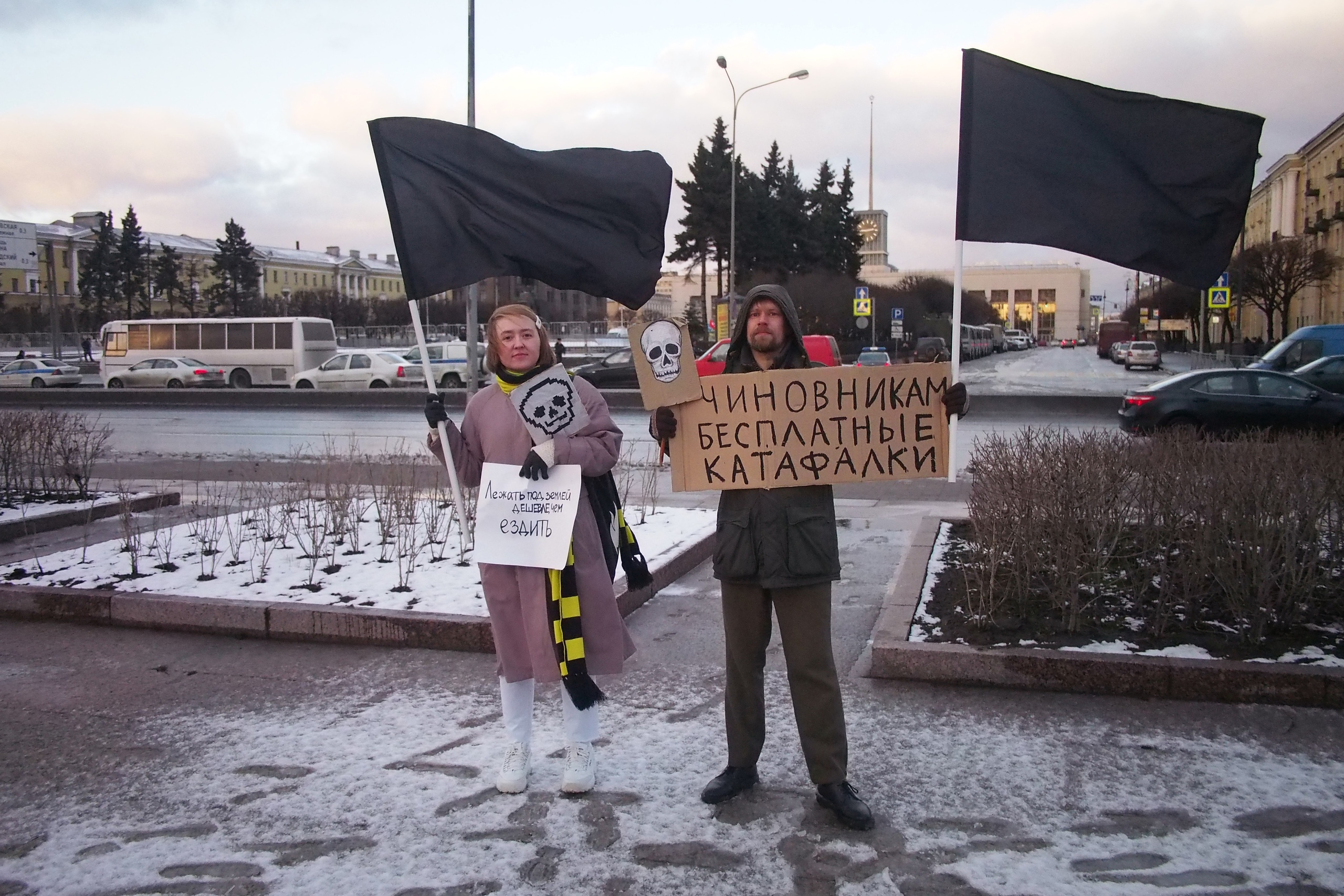 Из материалов дела следует, что активисты были задержаны за использование атрибутики в виде черепа и черного флага, а также плакатов "Лежать под землёй дешевле, чем ездить", "Губернатора под землю" и "Чиновникам бесплатные катафалки".