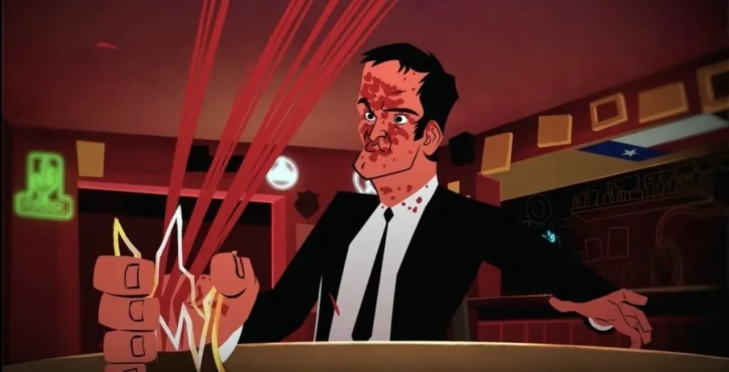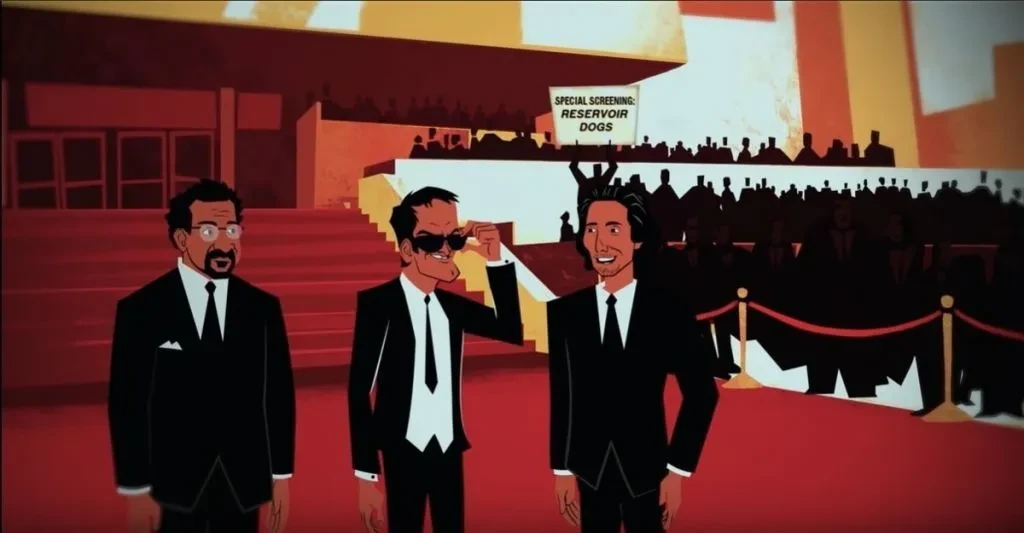 Видим воочию, как слава в одночасье после ночного показа «Бешеных псов» в Каннах сваливается на голову неизвестному выскочке. И вот уже живые классики Стоун, Верховен, Кэмерон мечтают с ним встретиться. А сам анимационный «выскочка» горделиво ступает по Круазетт, раскланиваясь с обретенными поклонниками.