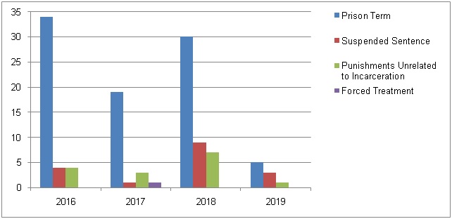 As is evident from the above data, half of those convicted for violence (5 out of 10) have received prison time of various lengths. However, the share of suspended sentences is on the rise for the second consecutive year, having reached 30% in 2019 (3 out of 10), as compared to 20% (9 out of 45) in 2018.