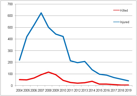 [27] Attacks of this type peaked in 2007 (7 killed, 118 injured); the numbers have since been steadily declining. After 2013, trends have been unstable.