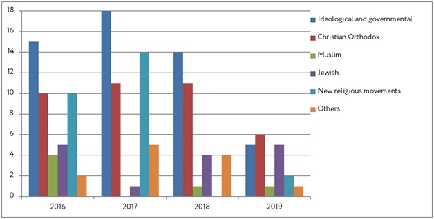 As before, most of these acts target religious sites and objects. Russian Orthodox churches and crosses were the most frequent target of desecration (six incidents in 2019 vs. 11 in 2018). Jewish sites come in second with five instances (four in 2018). New religious movements experienced two incidents of building damage (none reported in 2018). Muslim and Catholic sites and objects had one incident each; in 2018, one act of desecration against a Muslim site was reported, and none against Catholic sites.