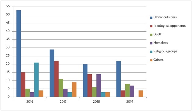 Those whom attackers perceived as “ethnic outsiders” remain the largest group of victims, and their numbers have increased compared to the previous year. In 2019, we recorded 21 ethnically motivated attacks. In 2018, we reported 20 victims.