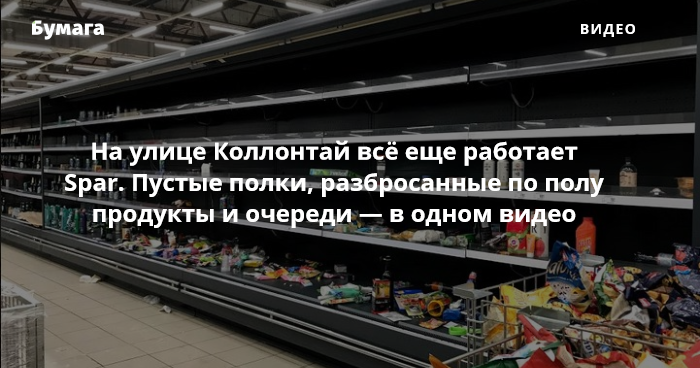 На улице Коллонтай в Невском районе до сих пор работает супермаркет Spar, хотя большинство точек сети в Петербурге закрыли в декабре 2019 года из-за финансовых проблем. В магазине, несмотря на пустые полки и разбросанные по полу продукты, много людей — они приходят из-за скидок.