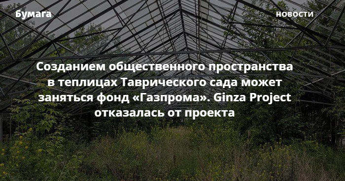Ранее о намерении заняться реконструкцией теплиц Таврического сада также заявляла Ginza Project. Гендиректор компании Максим Ползиков объяснил, что они отказались от участия в конкурсе, так как власти решили сместить фокус проекта «в сторону большей социально-культурной направленности». Это увеличило нагрузку на инвесторов и изменило экономические параметры реконструкции, отметил Ползиков.