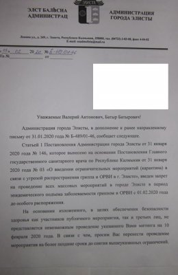 По словам Бадмаева, постановление администрации Элисты о карантине не распространяется «на улицы и площади», а второе письмо чиновники направили позже установленного законом срока.