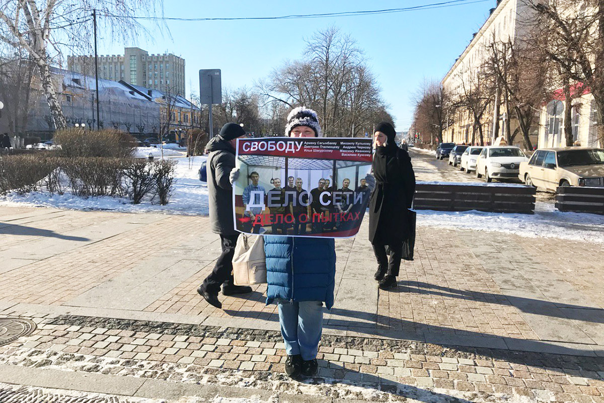Следующие пару часов около 50 человек сменяли друг друга в одиночных пикетах в поддержку ребят из дела «Сети». Чуть ли не ко всем успели подойти сотрудники полиции. Большинство пикетирующих были к этому готовы и знали, что в таких случаях нужно делать, а чего делать не стоит. А в случае чего, рядом всегда находились те, кто готов был помочь с советом.