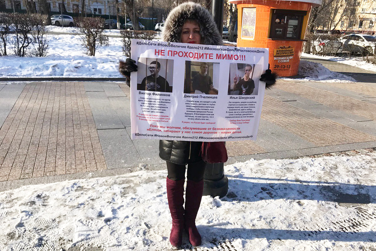 Скоро пришла Татьяна Чернова — мать еще одного фигуранта дела «Сети» Андрея Чернова. Она привезла из Москвы три плаката для одиночных пикетов: с Василием Куксовым, Максимом Иванкиным и своим сыном.
