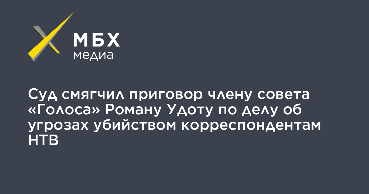 Химкинский городской суд смягчил приговор члену совета движения «Голос» Роману Удоту по делу об угрозах убийством сотрудникам НТВ (статья 119 УК). Об этом сообщает корреспондент «МБХ медиа».