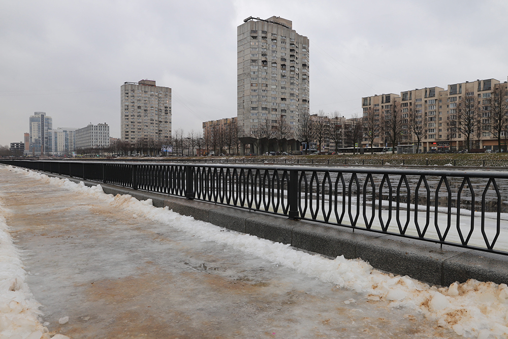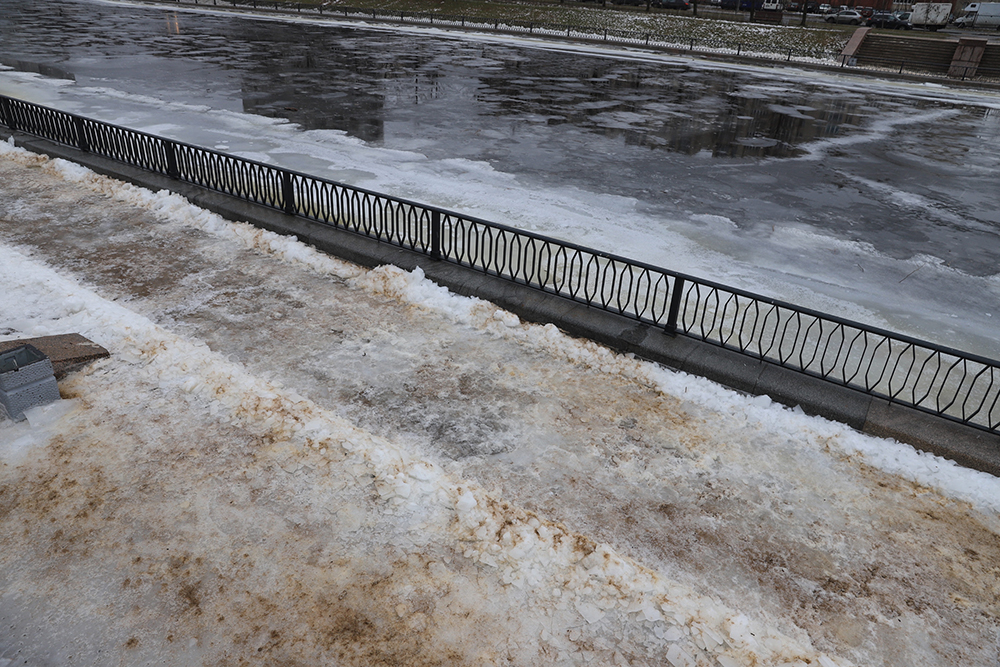 С началом морозов вода на набережной заледенела и превратилась в настоящий каток. При этом лед никто не скалывал, а тротуары не посыпали солью, писала «Фонтанка».