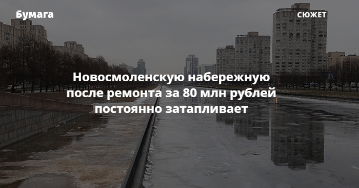 На подтопления недавно отремонтированной Новосмоленской набережной местные жители жалуются с сентября. По их наблюдениям, после реконструкции вода перестала уходить через стоки. Как рассказывали активисты, по тротуарам даже плавали утки.