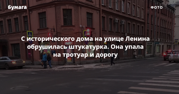 С дома № 29 по улице Ленина в Петроградском районе обрушилась штукатурка. Об этом рассказали очевидцы в социальных сетях.
