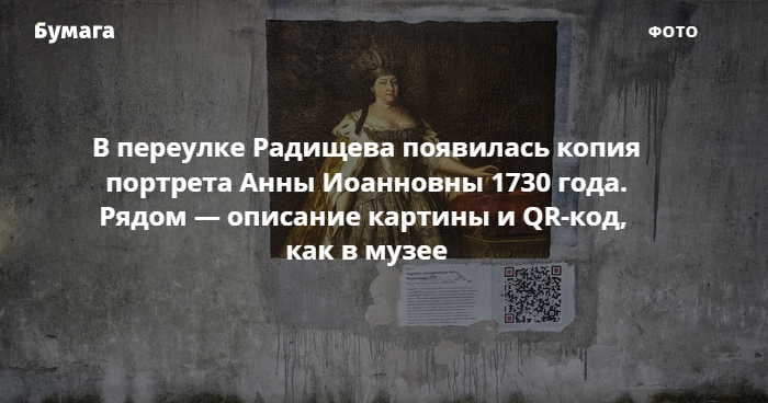 На стене дома в переулке Радищева в Петербурге разместили копию портрета Анны Иоанновны 1730 года работы Луи Каравака из собрания Третьяковской галереи. Об этом на своей странице во «ВКонтакте» рассказал автор уничтоженной галереи фресок, которая находилась там же, Олег Лукьянов.