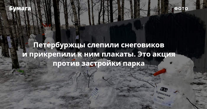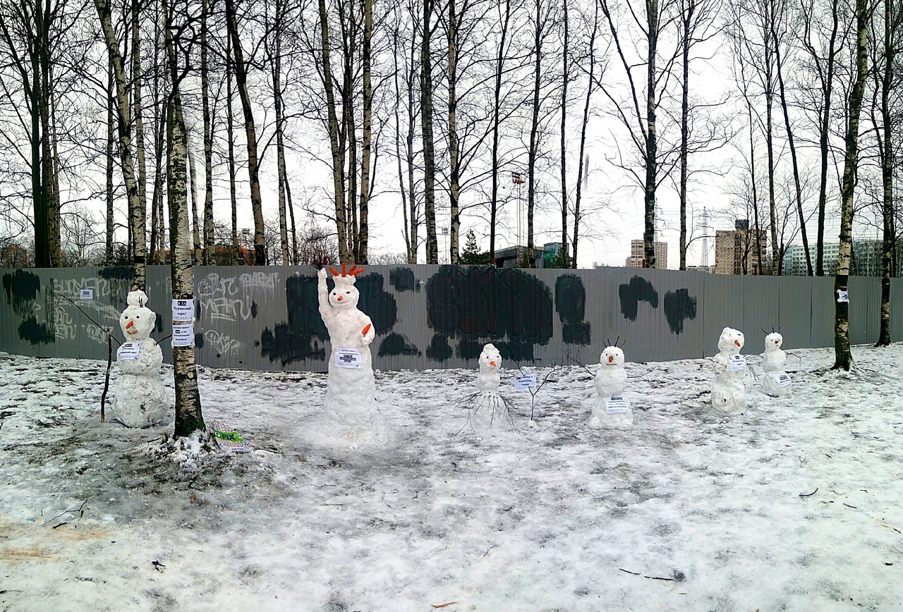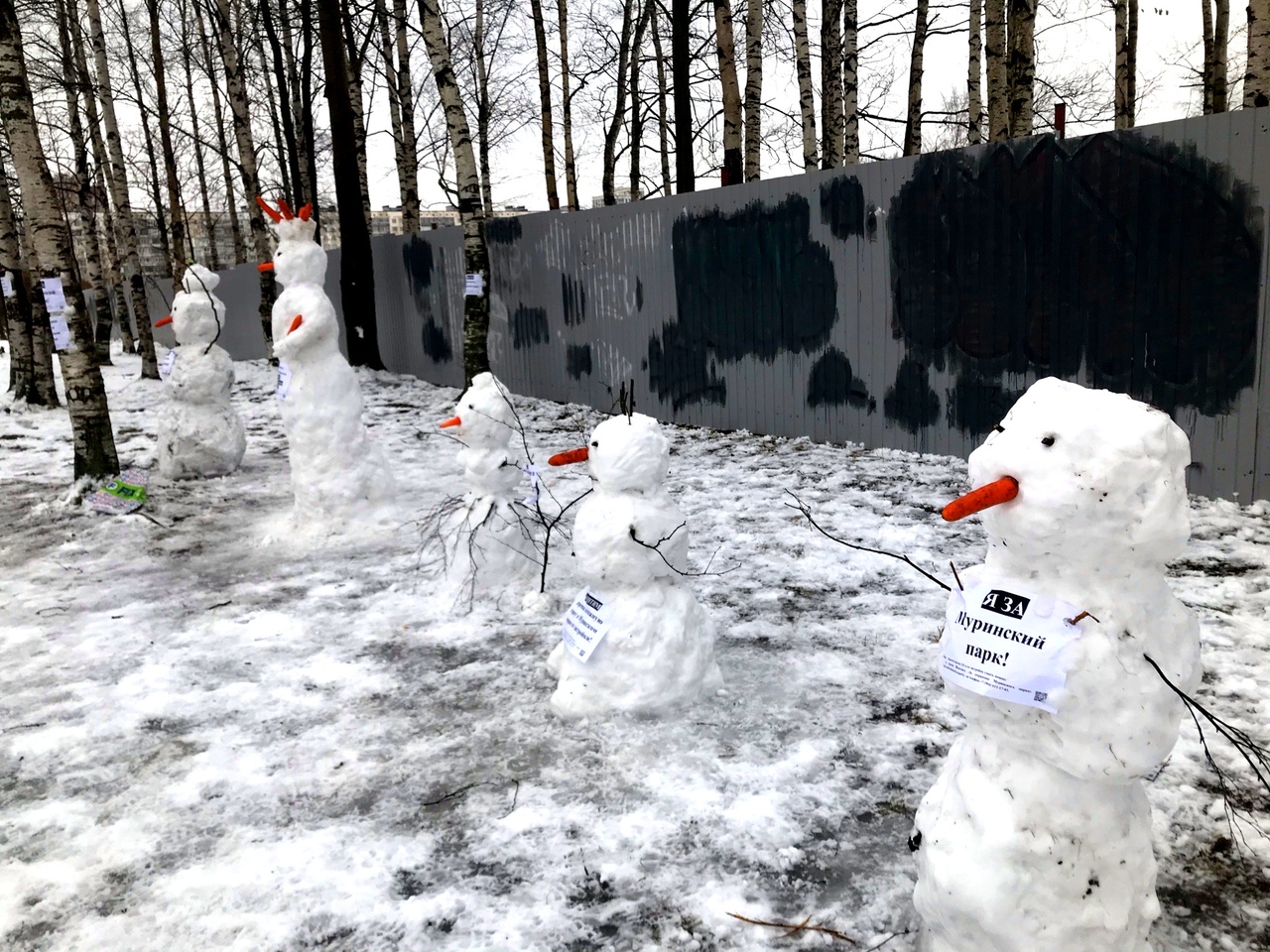 В парке слепили снеговиков, к которым прикрепили плакаты с надписями «Берегите природу, мать вашу» и «Хватит уничтожать Муринский парк». Таким образом жители протестуют из-за строительства спортивной арены, которую должна возвести компания «Анна Нова».