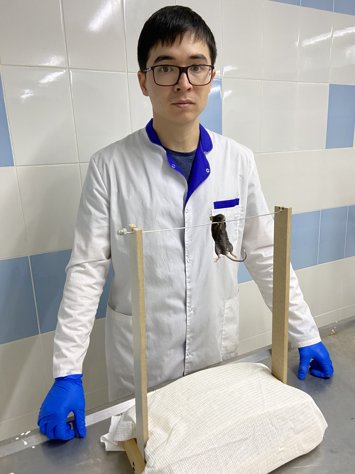 Михаил Дубинин проводит тест на струне Ученые исследовали состояние структур митохондрий, связанных с транспортом кальция в митохондриях скелетных мышц. Для этого использовали мышей с точечной мутацией в гене дистрофина, а также здоровых животных в качестве контроля. Сначала проводили тест на струне: мышь висит на жесткой проволоке, держась за нее передними лапами, ее задача — провисеть 30 секунд. В зависимости от результата прохождения теста ученые делали вывод о ее физической силе и выносливости. Для изучения структуры митохондрий готовили препараты мышечной ткани бедра и фиксировали их в специальном растворе. Затем образцы обезвоживали концентрированными спиртами и помещали в капсулу со смолой. Ультратонкие срезы мышечной ткани наблюдали под электронным микроскопом. На следующем этапе исследовали, как митохондрии поглощают, высвобождают и удерживают ионы кальция. Оказалось, что при развитии мышечной дистрофии Дюшенна в этих органеллах меняются структура и роль систем, ответственных за транспорт ионов кальция. С одной стороны, снижается эффективность накопления кальция, с другой — митохондрии намного хуже удерживают ионы.
